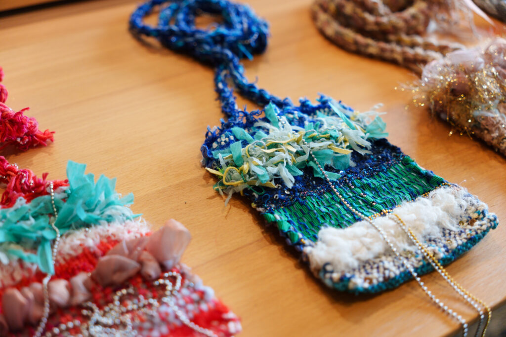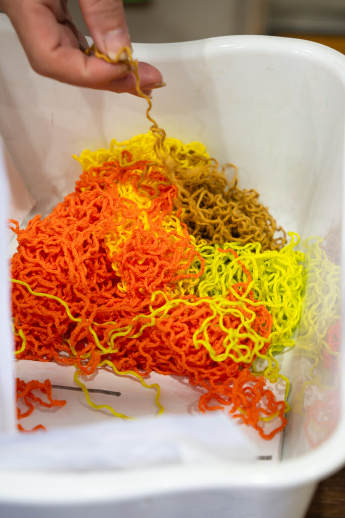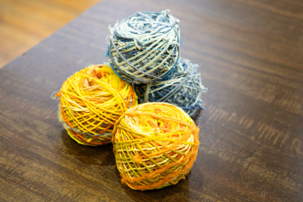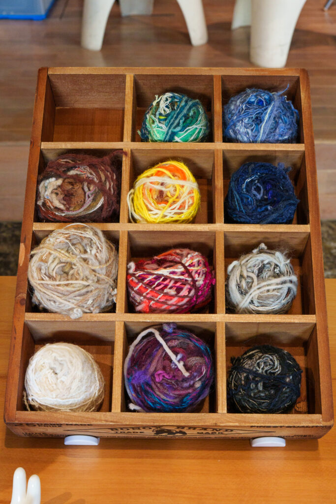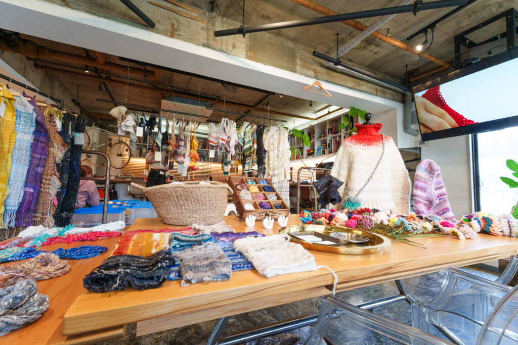 各施設でつくられた毛糸玉はポップアップで販売される。手編みニットにこの糸を混ぜると、奥行きのある表情になる。