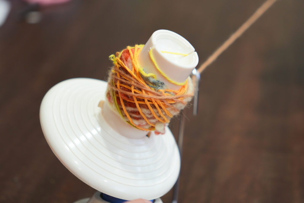 アイロンを掛けた糸を手回し器具で糸玉にしていく。カラカラと音を立てて毛玉ができあがっていく。