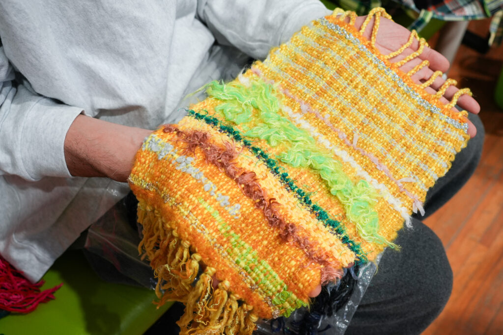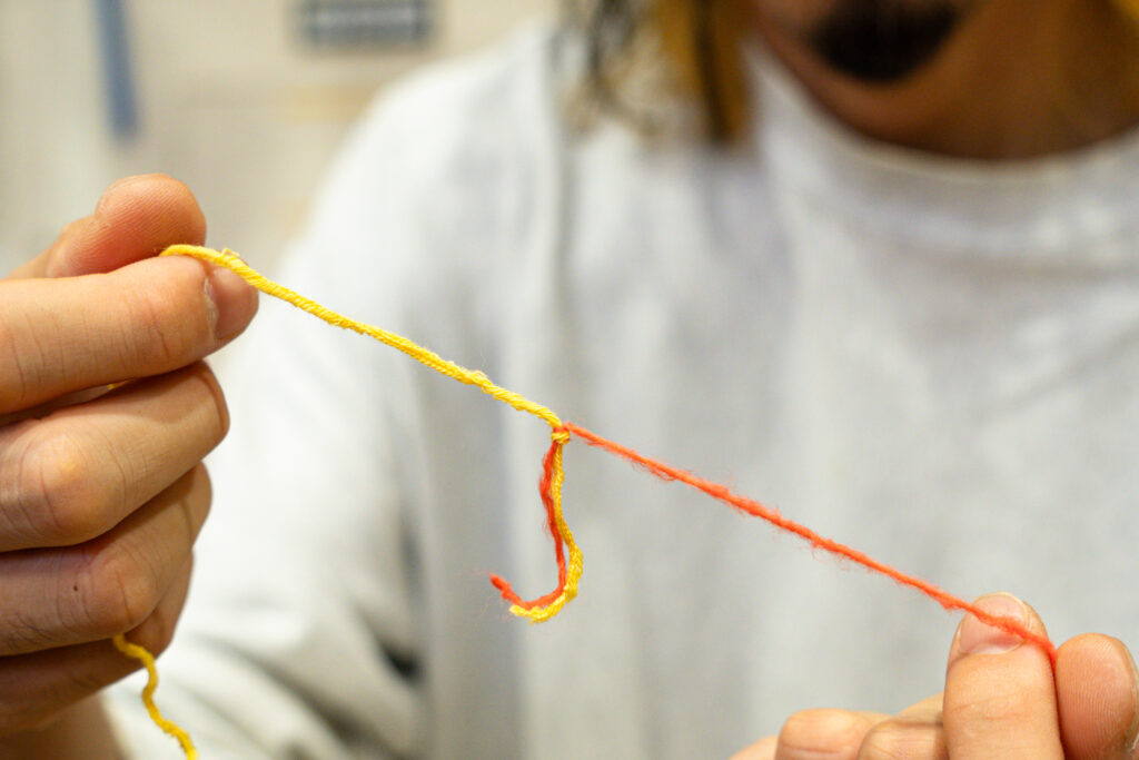最初に原料の糸を一本一本手で結んでいく。ただこの作業はかなり難しいため、原則として施設の職人の方々が行っている。できあがった長い糸を施設メンバーに渡して、彼らが新しいニット製品に利用できる状態のいい糸に再生していく。
