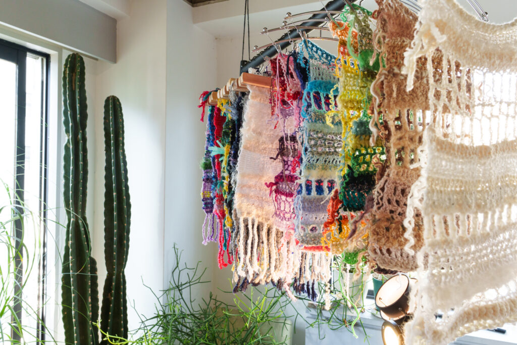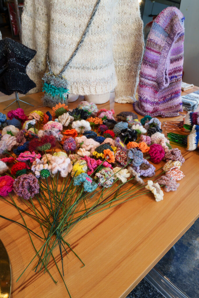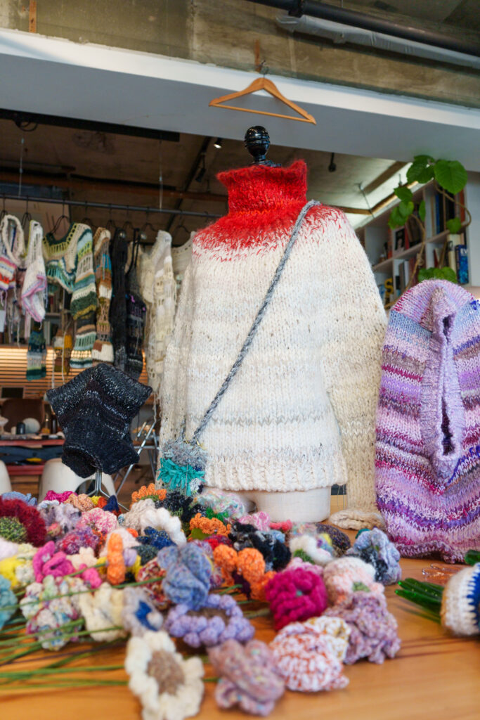 ここに掲載した写真は、定期的に開催されているオーダー&販売のポップアップショップ、及びワークショップの会場風景(2025年11月、東京・渋谷にて)。韓国ガールズグループのルセラフィムのメンバーから人気に火がついた手編みニットのブームの追い風もあり、お客さんにダイレクトに商品を見てもらうイベントには一般の若い手編み好きもやってくる。