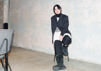 伴さん自身も編み手であり、記事冒頭で彼が着ている青のクルーネックセーターは自ら編んだもの。つないだ結び目から飛び出た糸もそのまま活かし、手仕事のニュアンスを表現。着たくなるスタイリッシュな服に仕上げている。